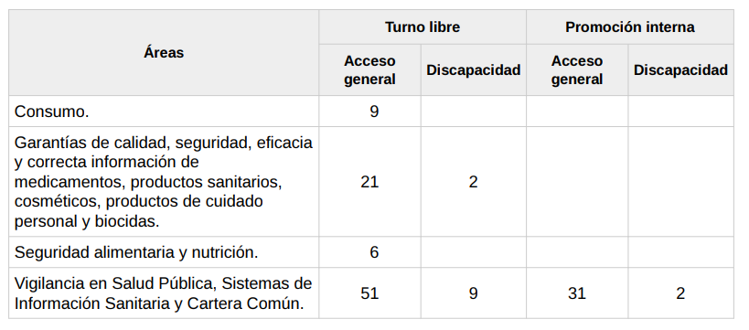 La distribución de plazas convocadas en 2025 para ETGOA, especialidad sanidad y consumo, por áreas es la siguiente: